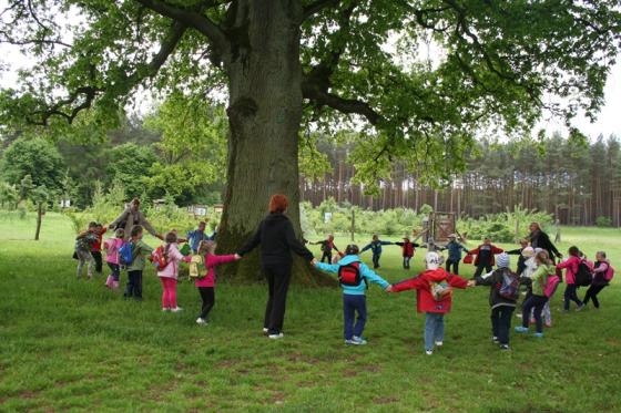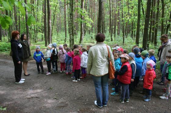 Spotkanie rozpoczęło się na ścieżce edukacyjnej w L-ctwie Rzeczyn. Przedszkolaki zapoznały się z ważniejszymi informacjami o nadleśnictwie. Rozpoznawały rośliny i zwierzęta. Dowiedziały się m.in. czym dokarmiamy zwierzęta, jakie pozostawiają po sobie ślady, oraz jak rozprzestrzeniają się rośliny. Następnie udaliśmy się na ścieżkę, gdzie odbyły się praktyczne ćwiczenia z rozpoznawania drzew i roślin runa. Po spacerze urządziliśmy sobie piknik a potem już tylko śpiewy i zabawy.