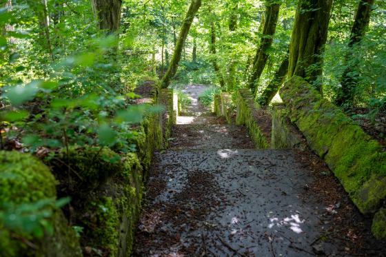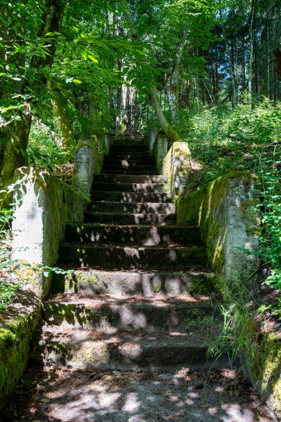 Ścieżka przebiega po śladach dawnych zabudowań dworu, zaczyna się przy schodach prowadzących z drogi do niewidocznych już pozostałości po zabudowaniach-stąd ich nazwa „schody do nieba”.
